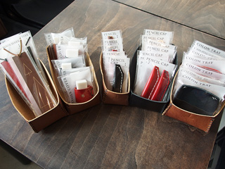 KAKURAの革製品は、細かなパーツ分けが少なく、面積の大きな一枚の革で作ることが多いため、どうしてもそれ以外の革がたくさんたまってきます。そこで「小さくても“革だからこそ”といった機能を考え、できるかぎり素材を無駄にしない」製品作りを行おう!と、『小さな革プロジェクト』をスタートしました。販売していただくお店では、専用レザーケースに入れた省スペースでのディスプレイができるようにしています。