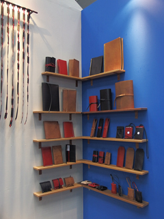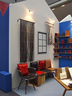 11月26日〜28日、東京ビッグサイトで開催された「IFFT interiorlifestyle living展」に初出展しました。今回、展示会特別企画“HOTEL”での展示で会場中央のアトリウムのほぼ真ん中。ブースデザインに取り入れた初めての青い壁、そしてホテル内のギャラリーショップをイメージして窓の絵を配置。青にブラウンや赤の革の色が目に新鮮に写り、木工作家「粂川悟志」氏に作ってもらったアンティーク素材の机やベンチもとても好評。全国から集まったたくさんの来場者の方々に見ていただけました。