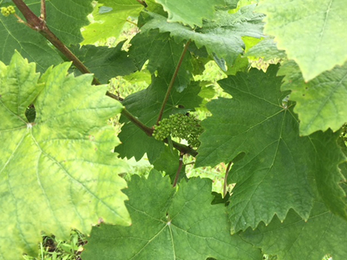 今年は雨続きで葡萄の生育が遅れ気味、もうとっくに花が咲いている時期なのにようやく小さな花が付き始めたところです。