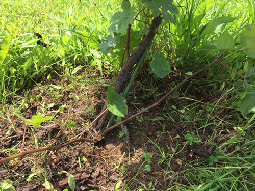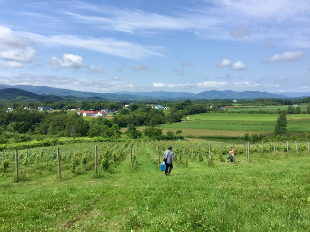 100%無化学農薬、無化学肥料の有機栽培に取り組まれているので、葡萄の苗周りは雑草が生い茂ります。それを一苗ずつ手作業で取り除くという地道な作業。ニセコの風景を見渡せる南向きの斜面、4名で各1畝に挑んだものの、横から伸びた葡萄の苗を間違って取らないよう腰を曲げての作業は結構大変です。約2時間かけても端まで到達できず!7月14日のこの日は奇跡的にお天気になったので、大阪よりも10度以上気温が低いとは言え、日陰がないので結構暑い。様々な虫や草と出会いながら有機栽培の一番大事な作業を身を以て体験するという貴重な時間をいただきました。「手を掛けたら掛けた分だけいいものができるんですよ。」とご主人。