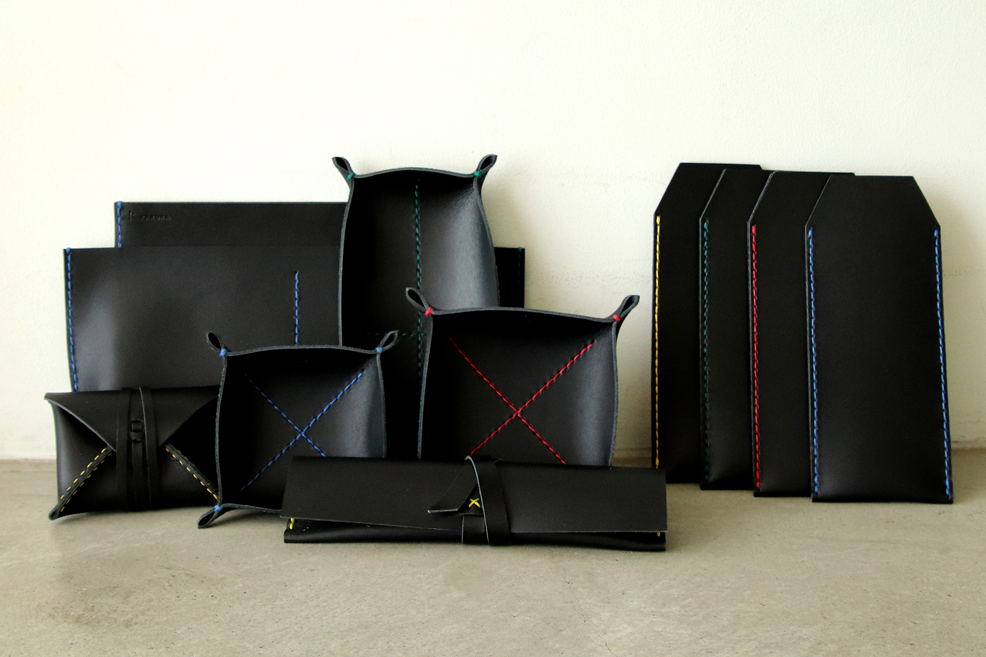 ブラックの革に鮮やかな配色の糸がアクセント。