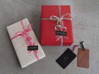 クリスマス用のラッピングを紹介させていただきます。左の箱が「こうぞペーパー」、右の箱が「レッドペーパー」。KAKURA ONLINE SHOPでご注文の際、無料でラッピングをさせていただきます。また、本日からONLINE SHOPで販売をスタートした「クリスマスレザータグ(定価525円)」をご希望の方には200円でお付けいたします。