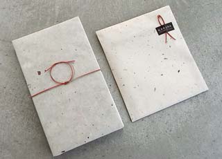 竹綴じカレンダーのギフトラッピングです。赤とグリーンの水引を使っています。左が…
